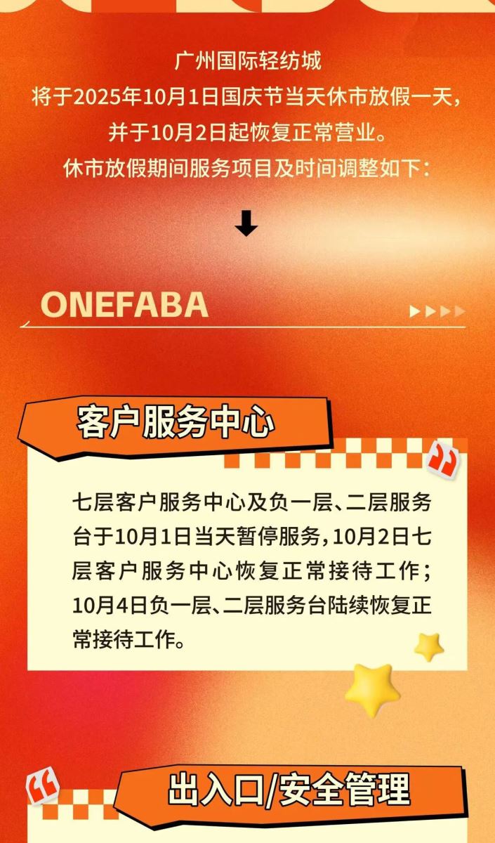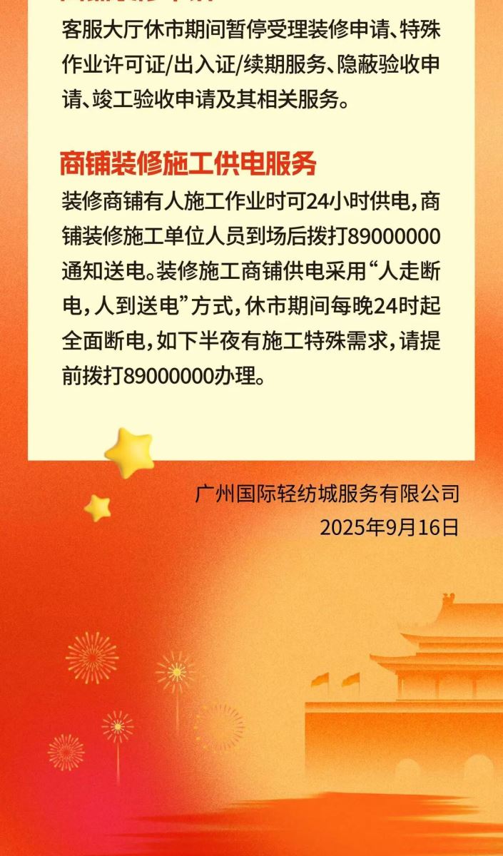 广州国际轻纺城国庆节当天休市一天,敬请采购商留意安排
